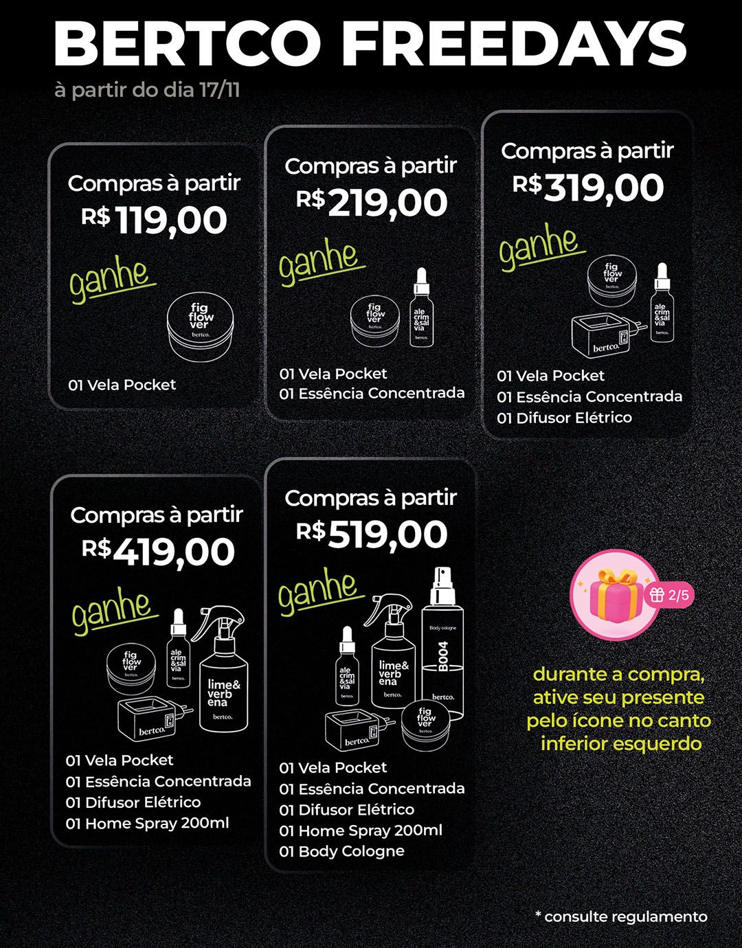 Os brindes são específicos em cada faixa de preço conforme mencionado acima.